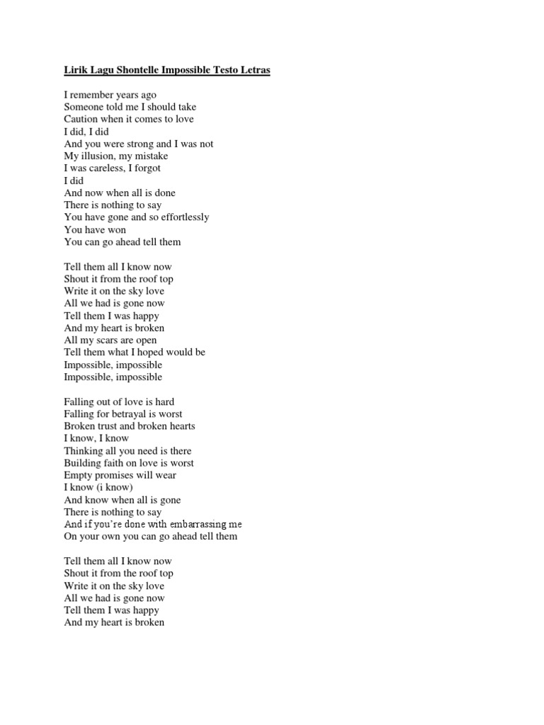 Ooh impossible yeah yeah Mustahil Verse I remember years ago Aku ingat tahun lalu Someone told me I should take Seseorang mengatakan kepadaku bahwa aku harus mengambil nya Caution when it comes to love Berhati-hati saat untuk mencintai I did I did Chorus Tell them all I know now Katakan kepada mereka semua aku tahu sekarang. Ooh impossible yeah yeah I remember years ago Someone told me I should take Caution when it comes to love I did. Ooh impossible yeah yeah I remember years ago Someone told me I should take Caution when it comes to love I did Tell them all I know now Shout it from the roof tops Write it on the sky line All we had is gone now Tell them I was happy And my heart is broken All my scars are open Tell them what I hoped would be Impossible impossible.